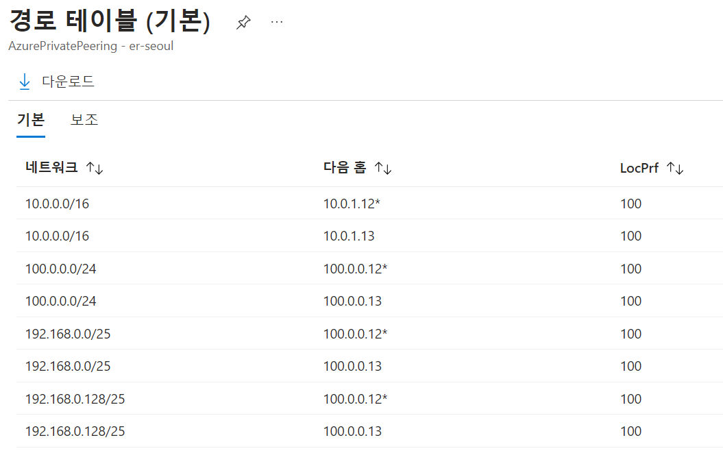 - ExpressRoute Circuit에서 [경로 테이블]을 확인합니다.