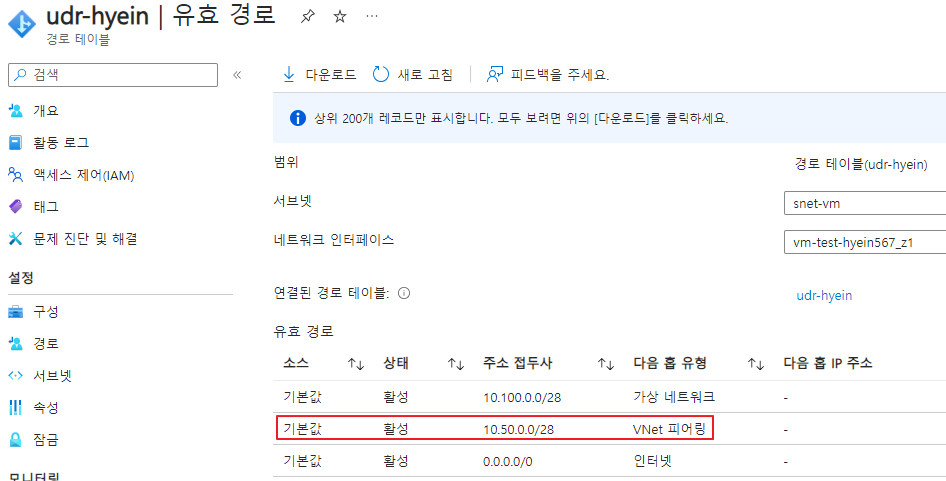 이전과는 다르게 다음 홉 유형을 VNet 피어링으로 가지는 경로가 추가되었습니다.