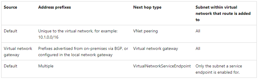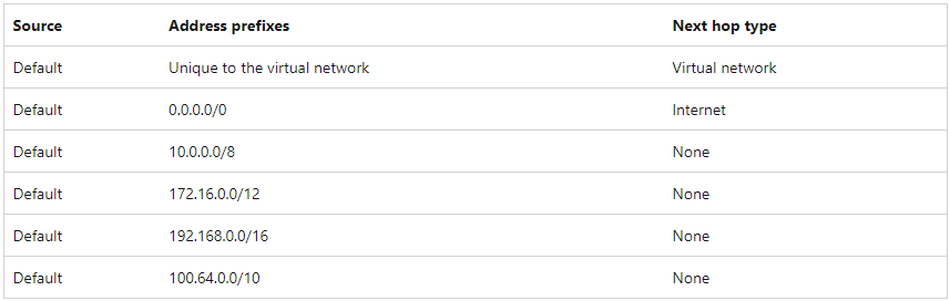 가상 네트워크가 생성될 때마다 각 서브넷에 대해 하기와 같은 기본 시스템 경로가 자동으로 생성됩니다.
