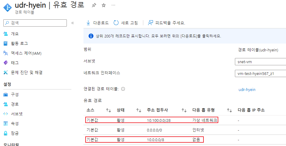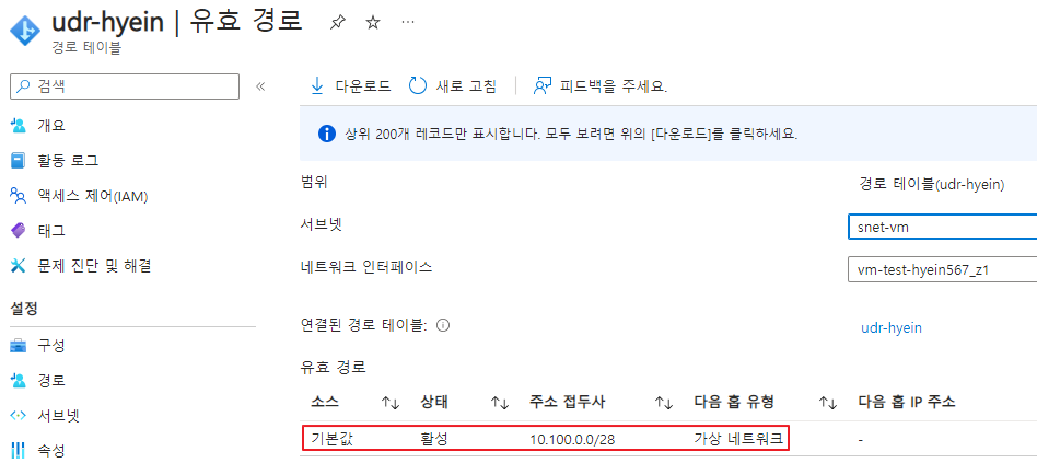 실제로 UDR과 snet-vm(10.100.0.0/29)과 snet-pe(10.100.0.8/29)라는 이름의 서브넷을 연결한 후 유효 경로를 확인해 보겠습니다.