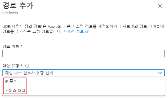 추가적으로 사용자 정의 경로 생성 시 선택할 수 있는 대상 유형은 다음과 같습니다.