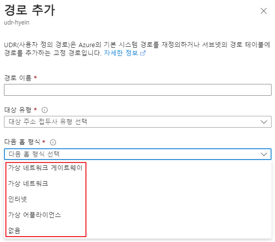 선택적 기본 경로에서도 위의 테이블 중 다음 홉 유형(Next hop type)에 대해 좀 더 알아보도록 하겠습니다.