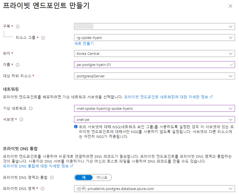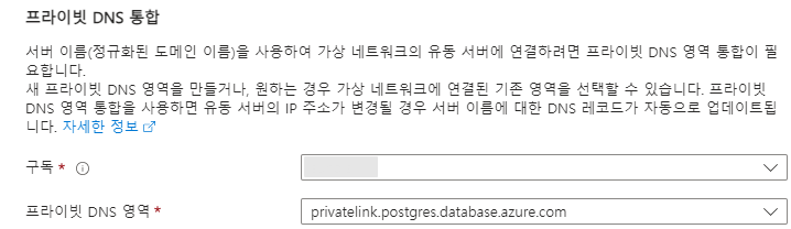 Spoke 가상 네트워크에서 필요한 서브넷은 상기 스크린샷에서 볼 수 있듯이 3개입니다. (VM용, Private Endpoint용, Azure Database for PostgreSQL에 대한 위임된 서브넷 용)