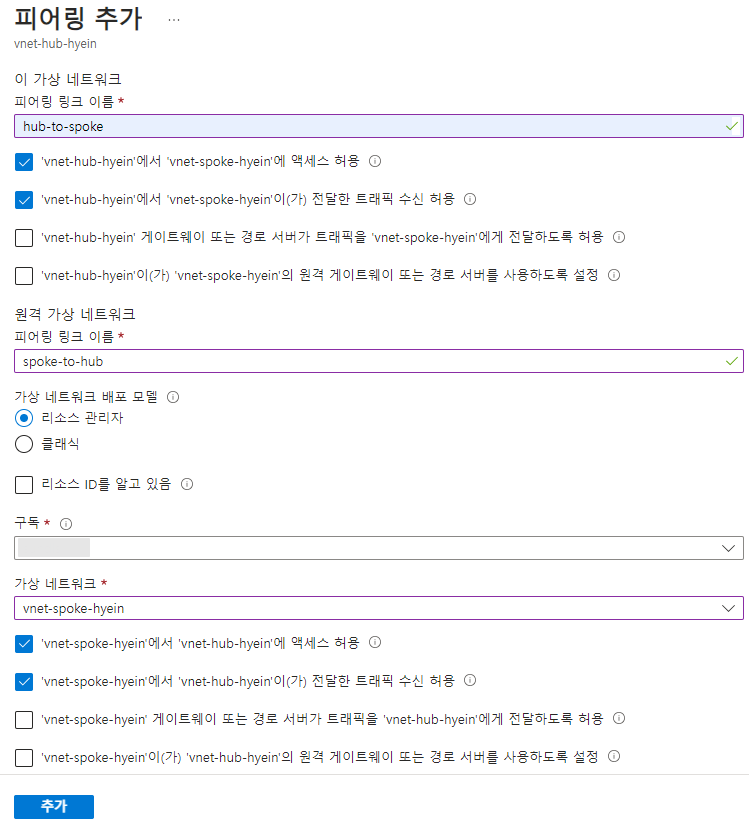 - Hub, Spoke 간 가상 네트워크 피어링 구성