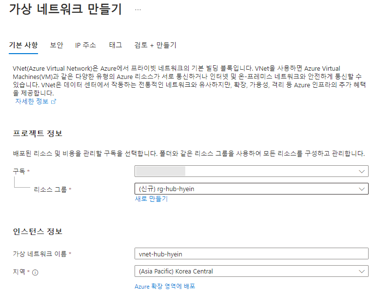 ※ 가상 머신 배포 과정은 Hub용, Spoke용 모두 동일합니다. (리소스 그룹 명, 가상 네트워크/서브넷 대역만 다르게 지정)