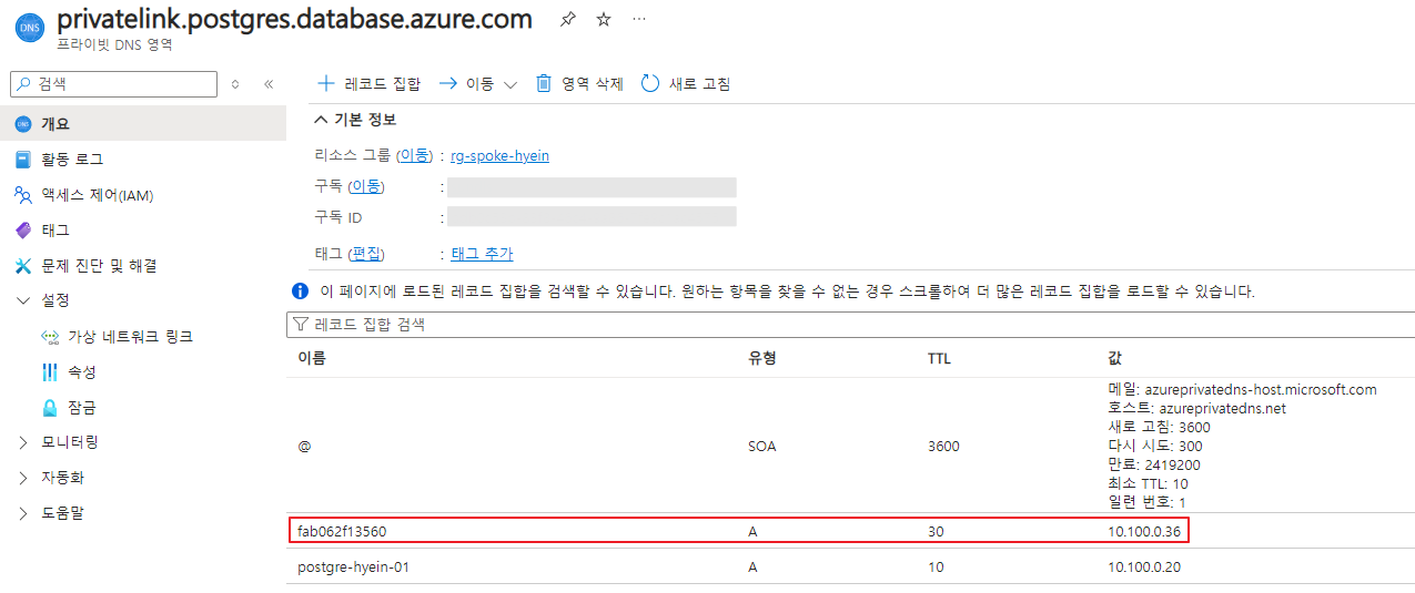 privatelink.postgres.database.azure.com이라는 이름의 Private DNS Zone으로 이동하여 레코드를 확인합니다.