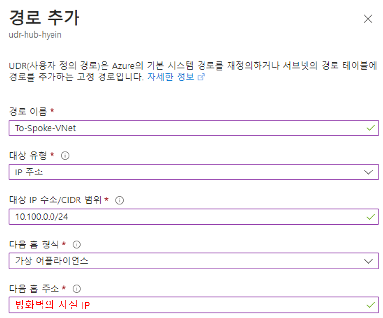 따라서, 경로 테이블에 Spoke 가상 네트워크 대역보다 작거나 동일한 크기의 대역에 대한 경로를 명시해 주어야 합니다.