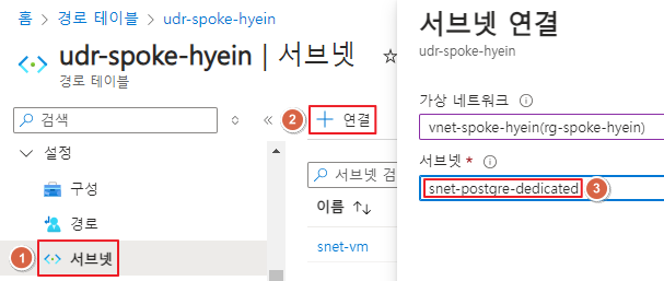 - Hub 가상 머신이 배포되어 있는 서브넷은 이미 Hub 대역의 경로 테이블과 연결되어 있기 때문에 서브넷 연결 과정은 진행하지 않아도 됩니다.