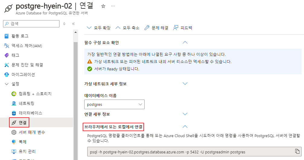 접근하기 위한 명령어는 Azure Database for PostgreSQL Flexible Server의 [설정] 블레이드 > [연결] 탭의 "브라우저에서 또는 로컬에서 연결" 섹션을 확인하면 됩니다.