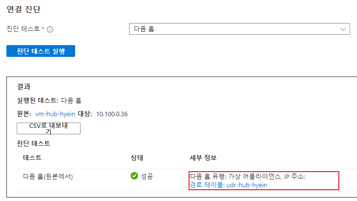 경로를 추가한 후 다시 연결 진단을 실행하면 이번에는 트래픽이 하기와 같이 다음 홉 유형이 Azure Firewall인 경로를 따라 흐르는 것을 확인할 수 있습니다.