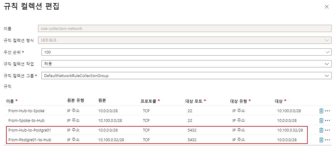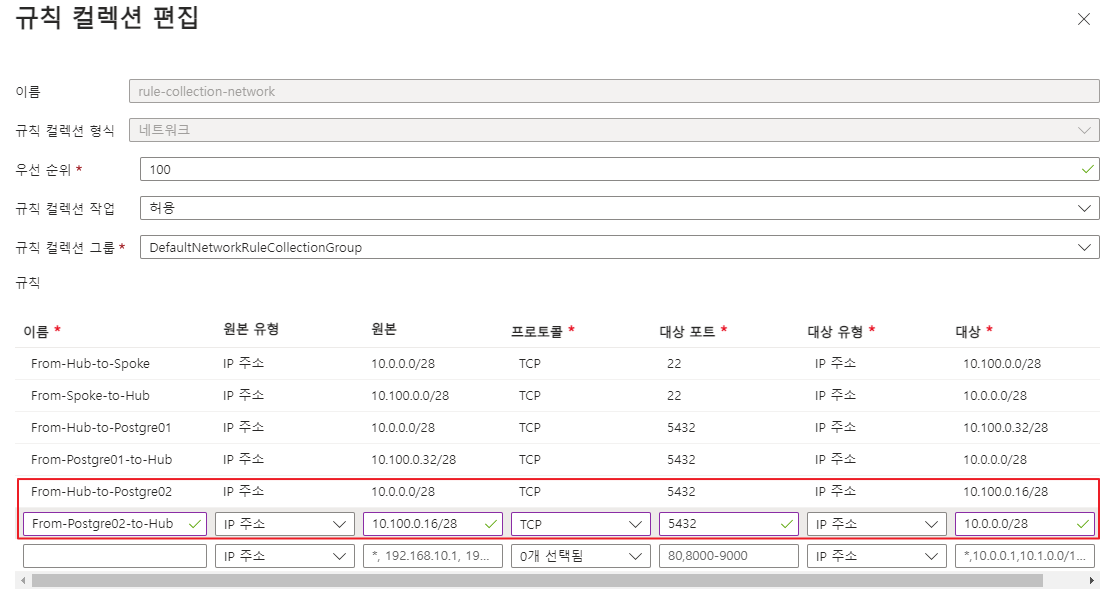 From-Hub-to-Postgre02 규칙의 대상에는 Postgre02와 연결된 Private Endpoint가 배포되어 있는 서브넷의 대역을 입력해 주면 됩니다.