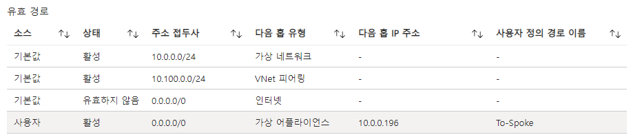 - Spoke 대역에서 Hub 가상 머신으로 가기 위한 경로는 이미 구성되어 있기 때문에 경로는 추가로 생성하지 않아도 됩니다.