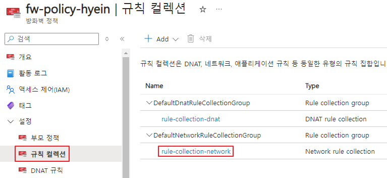 - [설정] 블레이드 > [규칙 컬렉션] 탭에서 Network 규칙 컬렉션을 선택합니다. (규칙을 한번에 추가하기 위함입니다.)