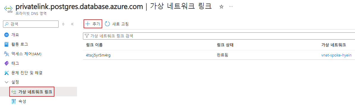 - privatelink.postgres.database.azure.com이라는 이름의 Private DNS Zone을 찾아 [설정] 블레이드의 [가상 네트워크 링크] 탭을 클릭합니다. [+ 추가] 버튼을 클릭하여 가상 네트워크 링크를 진행합니다.