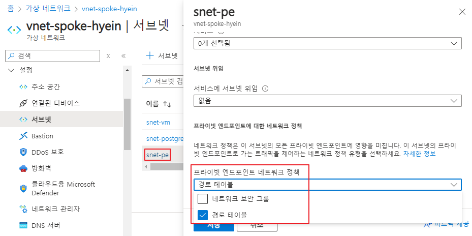경로 테이블을 구성하기에 앞서 먼저 서브넷의 "프라이빗 엔드포인트에 대한 네트워크 정책"을 활성화 시켜야 합니다.