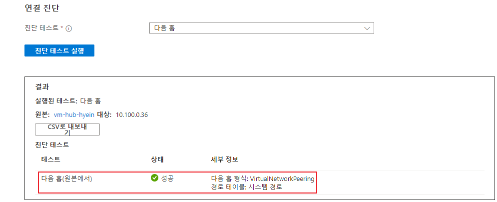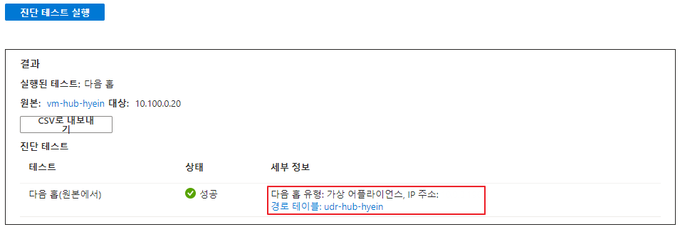 진단 테스트 결과 현재 다음 홉이 VirtualNetworkPeering으로 지정되어 있는 것을 확인할 수 있습니다.