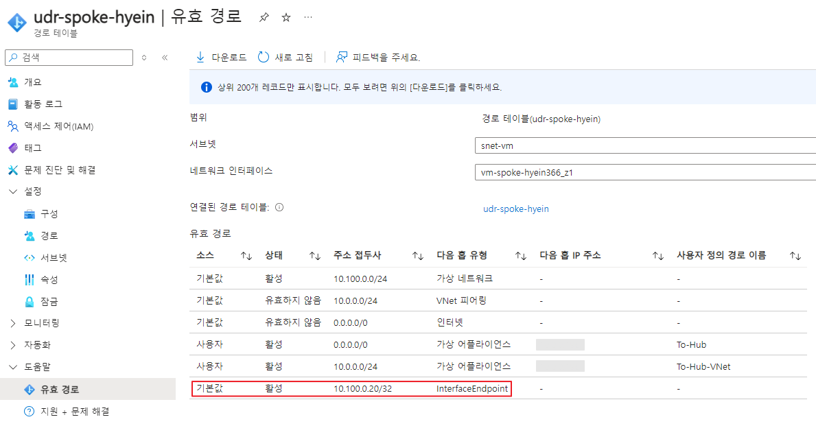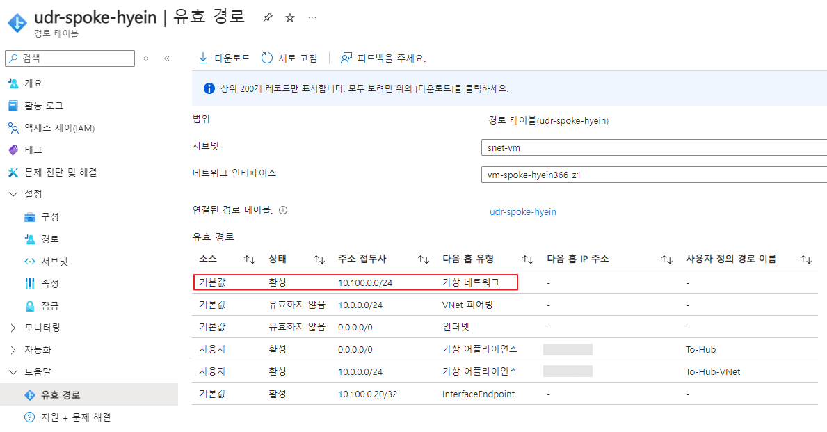 Spoke 가상 머신이 배포된 서브넷의 유효 경로는 상기 스크린샷과 같습니다.