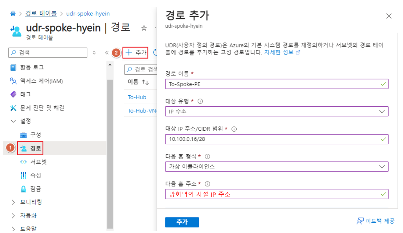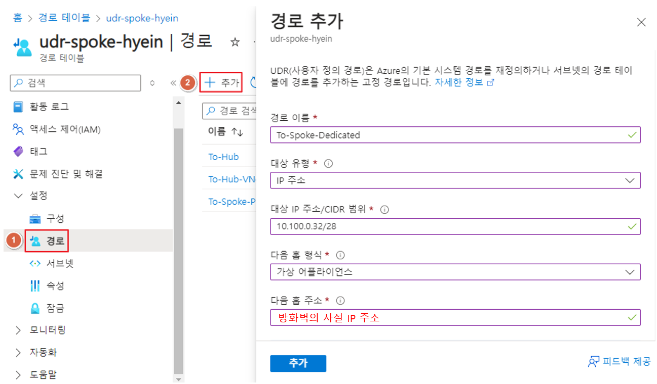 이를 위해 Spoke 경로 테이블에 서브넷 단위의 사용자 지정 경로를 추가해 줍니다.