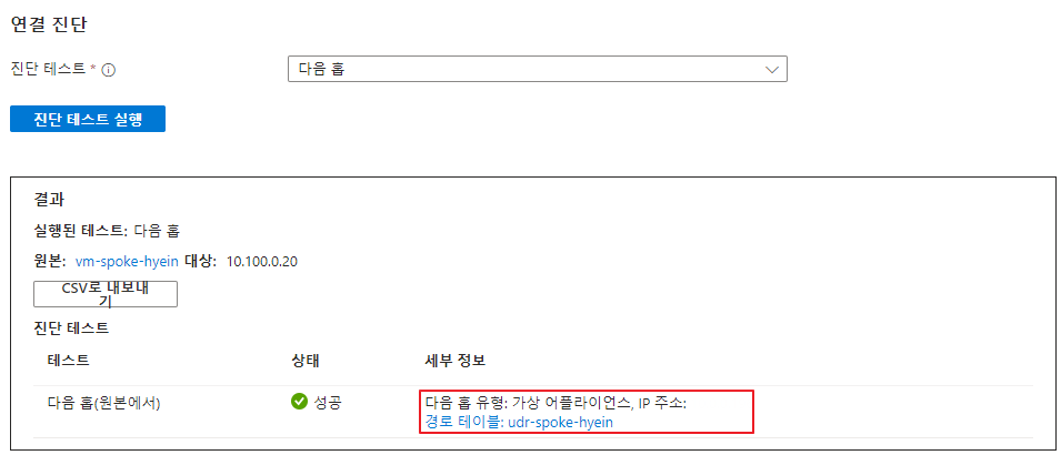 진단 결과 다음 홉 유형이 가상 어플라이언스(Azure Firewall)로 트래픽이 시스템 경로가 아닌 방금 전 지정해 준 사용자 지정 경로를 따라 흐르는 것을 알 수 있습니다.