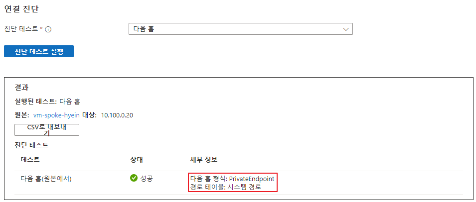 가상 머신의 [연결 문제 해결] 탭에서도 Private Endpoint의 Private IP를 목적지로 설정하여 다음 홉에 대한 진단을 실행하면 하기와 같이 트래픽이 다음 홉이 PrivateEndpoint인 시스템 경로를 따르는 것을 알 수 있습니다.