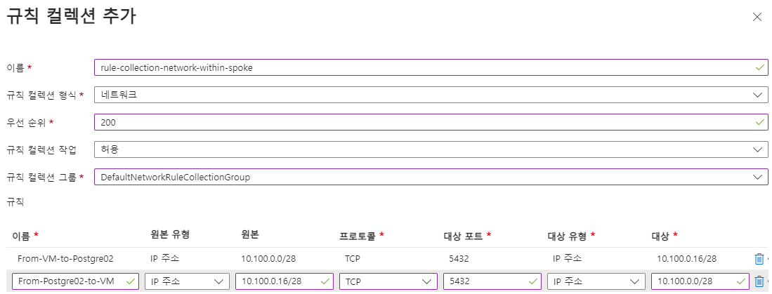 다음으로 Azure Firewall에 가상 머신 ↔ Azure Database for PostgreSQL Flexible Server (VNet Integration) 간 통신에 필요한 Network 규칙을 추가해 줍니다.