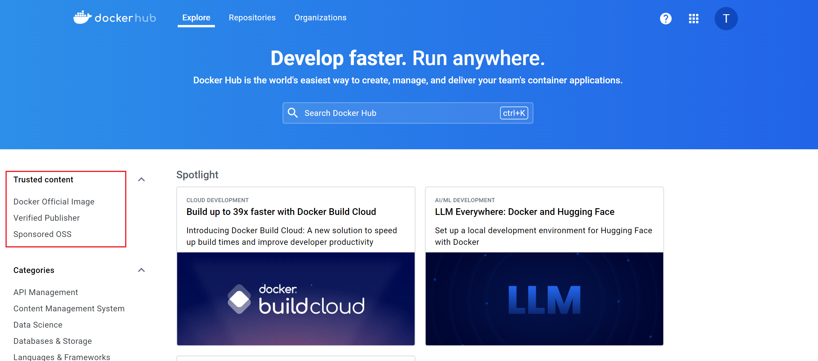 앞서 설명한 것처럼, Docker Hub는 Public 합니다. 따라서 공개된 이미지나 Pull 가능하며, Push 가능합니다. 다만, 보안 위험 등 존재할 수 있는 사고를 줄이고자 공식 이미지(Official Imgae), 인증된 게시자(Verified Publisher) 이미지 혹은 자신이 만든 이미지를 사용하는 것을 권장합니다.