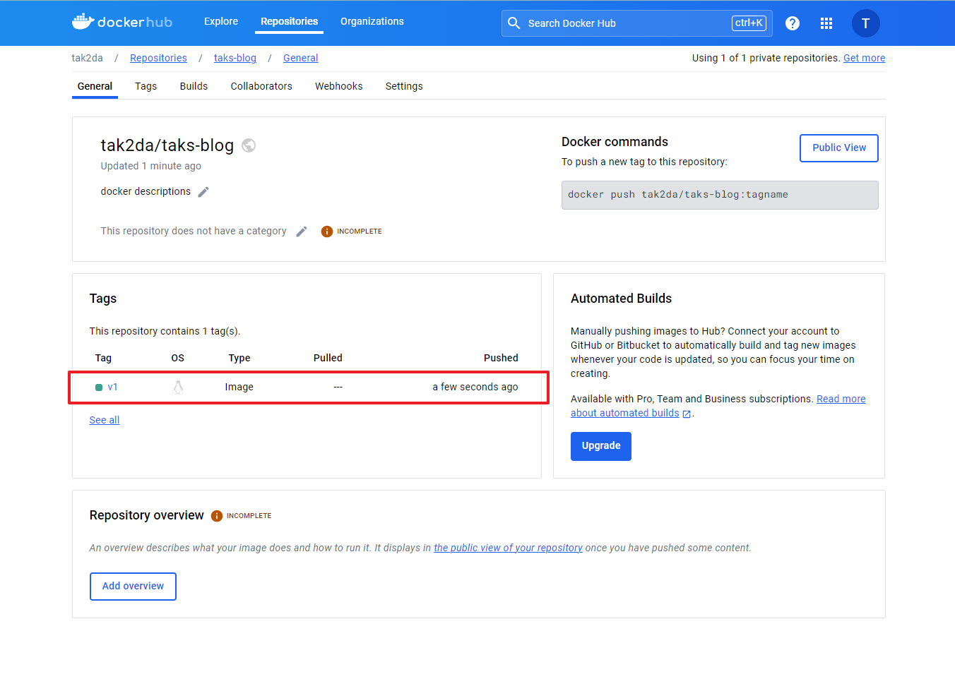 # 호스트(로컬)에 있는 'nginx_svr:modified001' 이미지를 Docker hub에 생성한 레포지토리 'tak2da/taks-blog:v1' 태그 설정