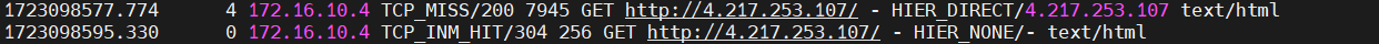 - access.log에 확인되는 응답 결과는 TCP_MISS/200인데, 이는 캐시에 저장된 정보가 없어 원격 서버로부터 데이터를 가져왔으며, 성공적으로 요청에 대해 응답했음을 의미합니다.