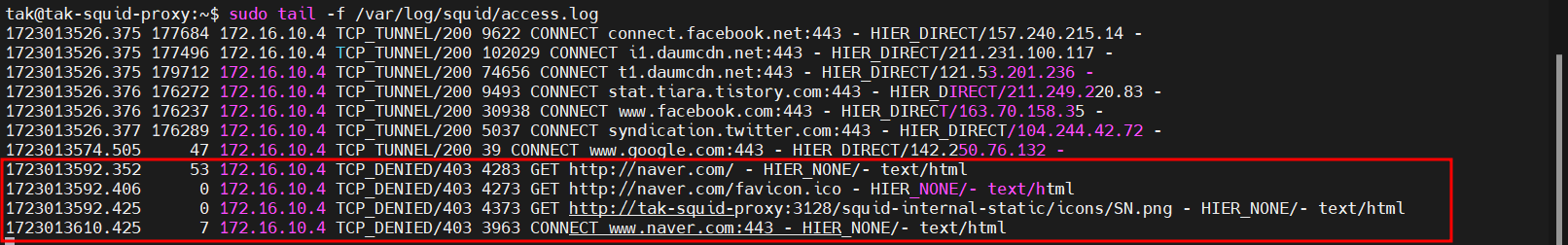 - Squid Proxy 의 (/var/log/squid/)access.log 확인 시, 403 응답 확인