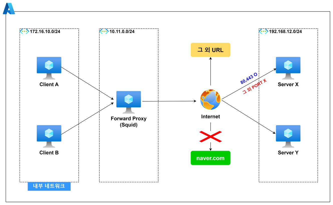 구성에 앞서 다시 한번 설명하자면, Forward Proxy는 클라이언트와 인터넷 사이에 위치하여 클라이언트의 요청을 대신 처리해 주는 서버입니다.