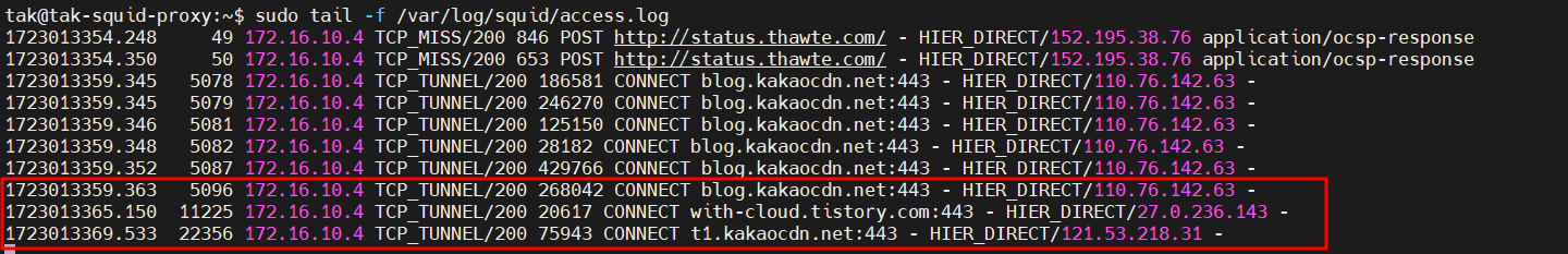 - Squid Proxy 의 (/var/log/squid/)access.log 확인 시, 200 응답 확인