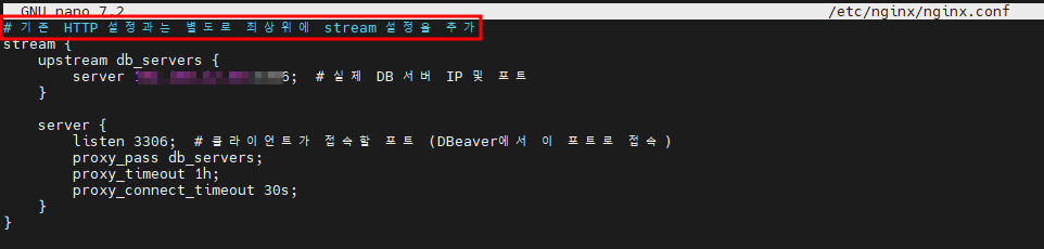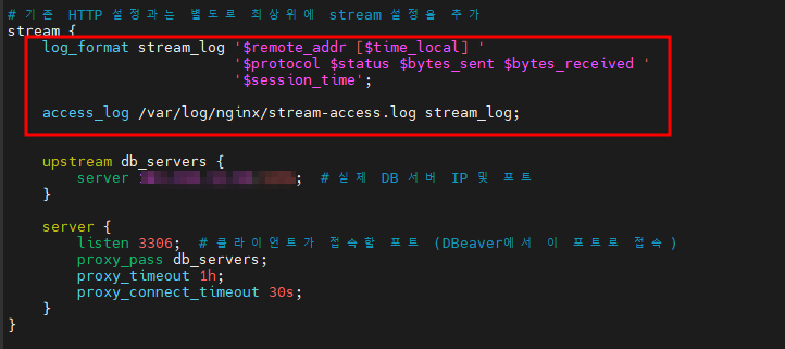 즉, 데이터베이스와 같은 TCP 서비스는 반드시 stream 모듈을 통해 설정해야 하며, HTTP 모듈을 통해서는 설정할 수 없습니다.