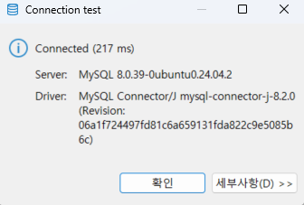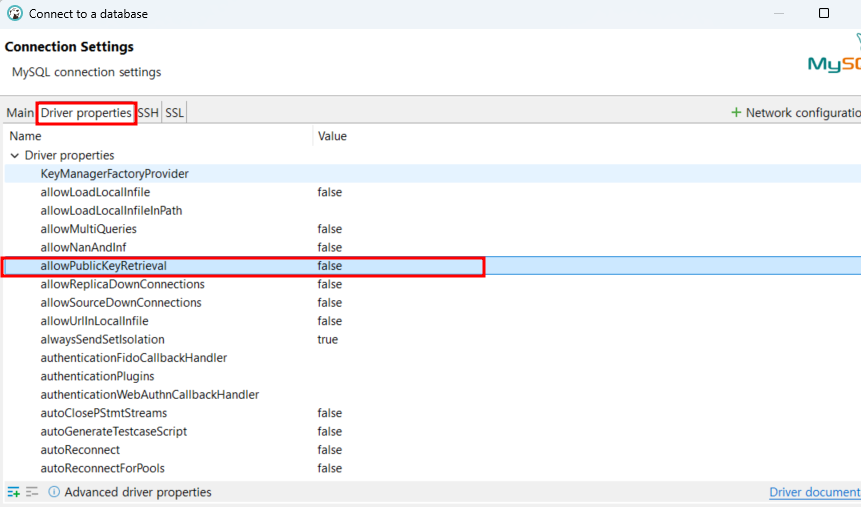 여기서, "Public Key Retrieval is not allowed" 에러 확인 시, [Driver properties] 탭에서 아래 항목을 "True" 변경하면 연결 문제를 해결할 수 있습니다.