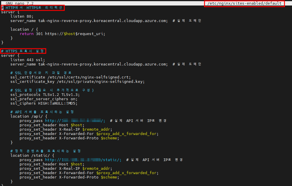 실제 Target 서버 프록시 전, SSL을 사용을 위한 인증 설정을 정의합니다. 이후, 각 서버의 구성에 맞춰 프록시 설정을 합니다.