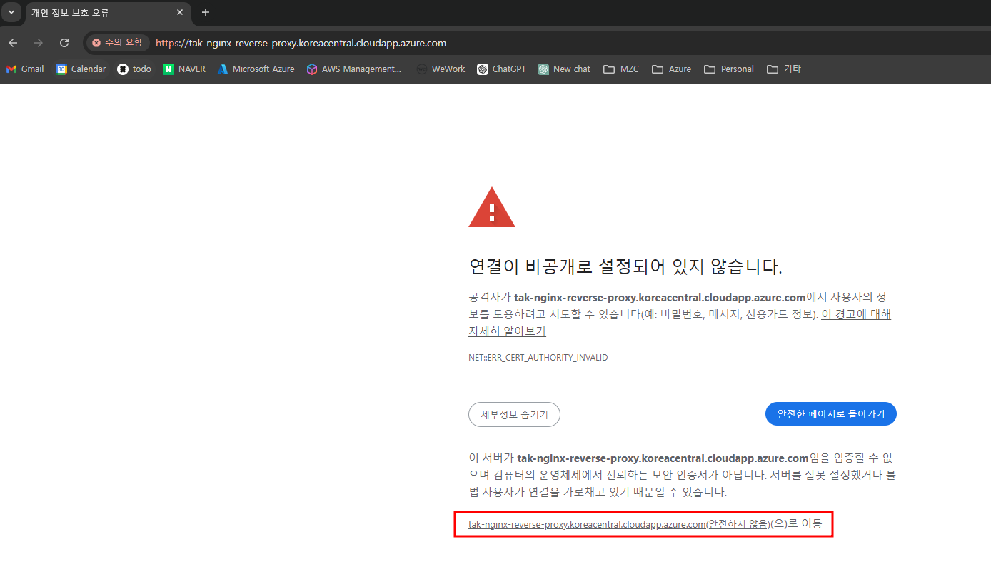 - 다만, 자체 서명 인증서 발급으로 인해, 신뢰할 수 없는 [인증서가 올바르지 않음]으로 표기