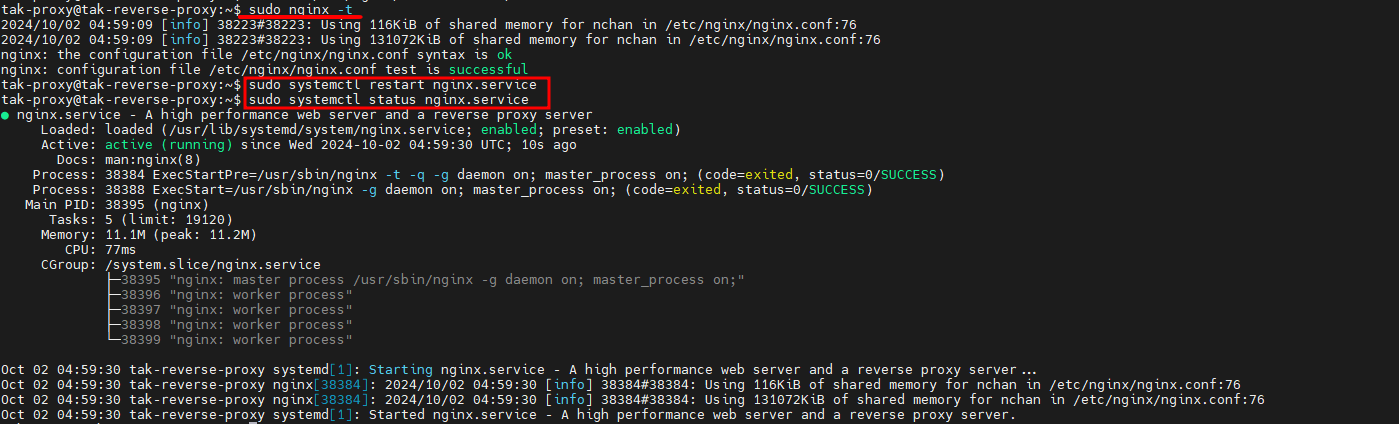 위 변경사항을 저장하고 Nginx가 올바르게 작동하는지 확인 후, 재시작합니다.