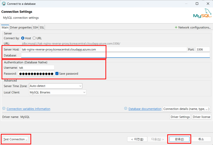 아래 3가지 항목 입력 후, [Test Connection] 을 통해 연결 여부를 확인하고 [완료] 클릭