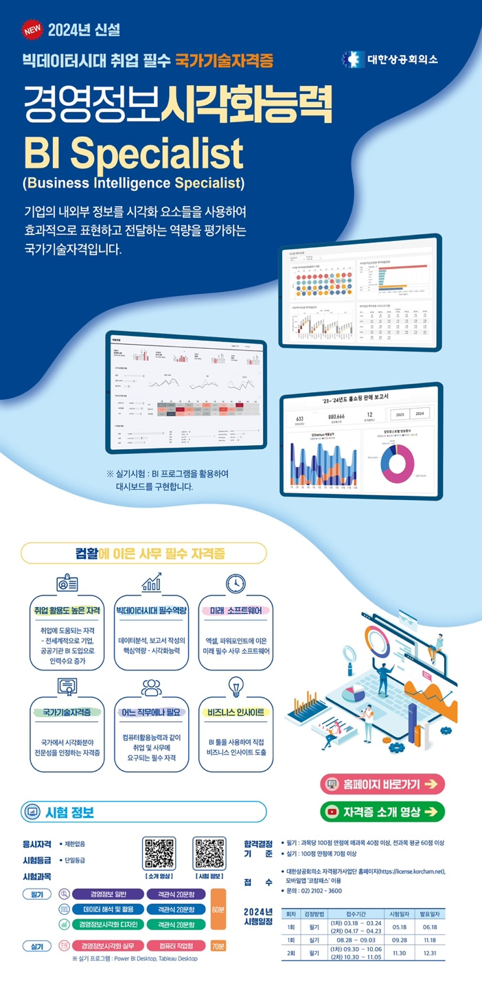 안녕하세요. TAK 입니다:) !!오늘은 따뜬한 자격증 정보를 들고 왔습니다!! 3월 어느날.. 데이터자격검정센터에서 메일이 와 확인해보니 신설 국가기술자격 경영정보시각화능력 안내를 하더랩죠... 조금 더 자세히 살펴보니, 대한상공회의소에서 시행하는 시험이더라구요. 2024년 신설되어 처음으로 시행하는 일정은 다시 한번 살펴보면 올해 필기는 2번, 실기는 1번으로 진행되네요. 첫 시험이다 보니, 수험자들의 이해를 돕기 위해 필기수험가이드북과 필기/실기 모의문제집을 무료로 배포하고 있다고 합니다. 보다 시험 관련 자세한 내용은 아래 공식 홈페이지에서 확인하면 좋을것 같아요:) https://license.korcham.net/co/examguide.do?mm=28&cd=0108 종목소개 시험안내 경영정보시..